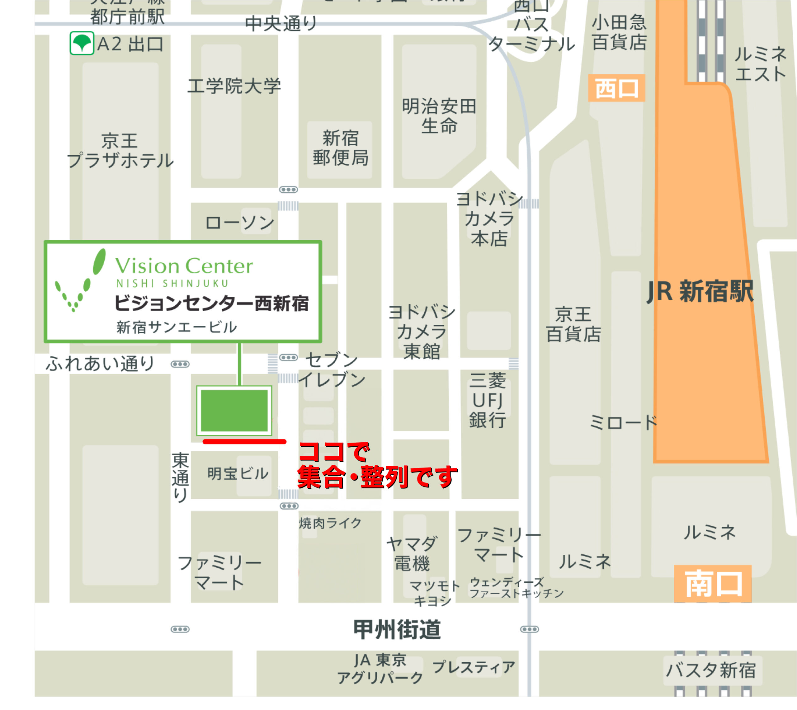 ビジョンセンター西新宿と明宝ビルの間の路上(地図画像の赤い部分)に集合してください。